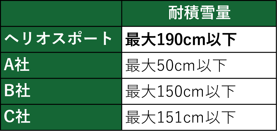 他社のソーラーカーポートの耐積雪量は最大150cm以下の製品がほとんどであるのに対し、弊社製品は最大190cm以下の製品を取り扱っております。