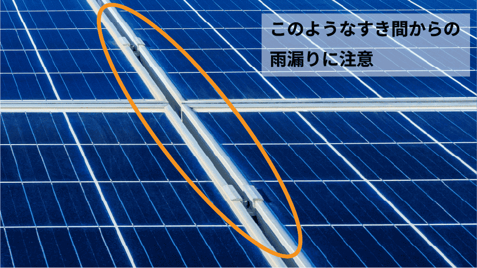 この対策として、太陽光パネルの取り付け部に特殊なシーリング材や防水パッキン、屋根の下に排水経路を設けることで雨水が速やかに外部へ排出されるようになっている商品もあります。